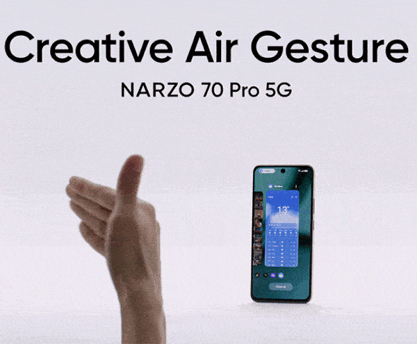 The Air Gesture feature on the narzo 70 Pro 5G will offer over ten gesture options, enhancing user experience by eliminating the need for physical contact, improving comfort and usability. This feature is particularly handy in real-life situations where touching the phone might be inconvenient, like when hands are wet, during meals, or when hands are dirty.