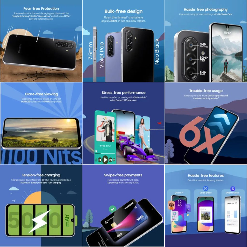 The Galaxy F17 5G keeps the triple rear camera system — a 50MP main sensor with optical image stabilization (OIS), a 5MP ultra-wide, and a 2MP macro camera — along with a 13MP front camera. It runs on Android 15 with Samsung’s One UI 7 user interface and will receive six major OS updates and six years of security updates.
